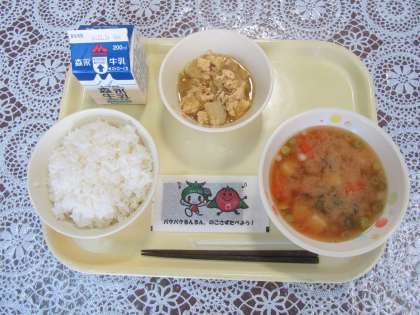 今日の給食は、子どもたちの大好きな「ミスターたまご丼」と鮭の切り身の入った「いしかり汁」です。特別に「のり」のパッケージには、大東市のマスコットのダイトン君と食育のキェラクター・トマッピーが「パクパクるんるん、のこさず食べよう!」と呼びかけています。子どもたちもきっと喜びます。