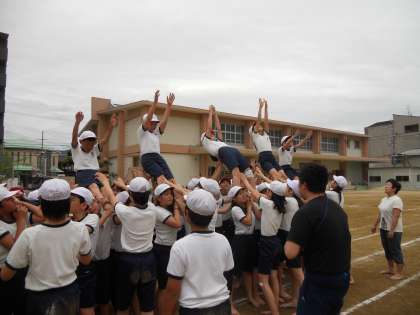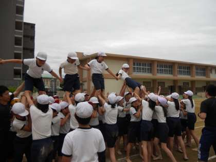 6年生の組立体操。今日は、「トラストフォール」を習得することがゴール。
