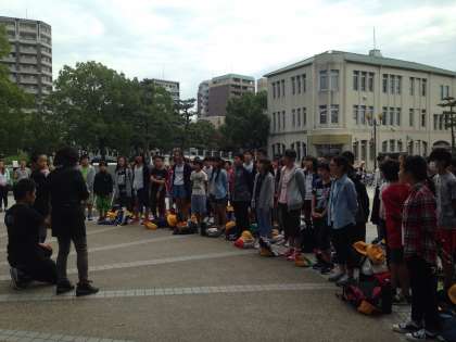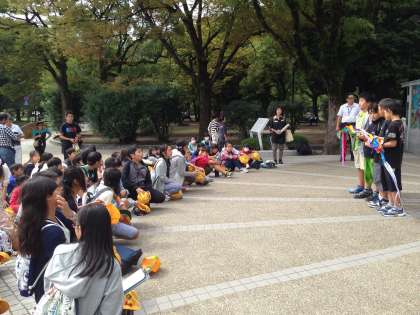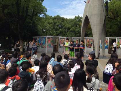 平和記念公園に着き、平和の集いが始まりました。住北っ子の平和への願い、折り鶴を捧げます。