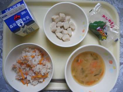 5月2日(火)の給食献立は、シーチキンごはん、みそ汁、高野豆腐のふくめ煮、かしわ餅、牛乳でした。