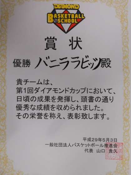 PTAバスケットボール同好会チーム「チョコラビッツ」の活動日に、ご指導いただいているミニバスケットボールクラブ「バニララビッツ」が、ダイヤモンドカップという大会に出場し、見事に優勝しました。