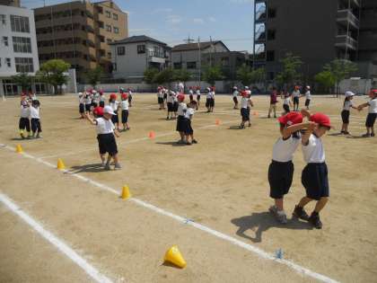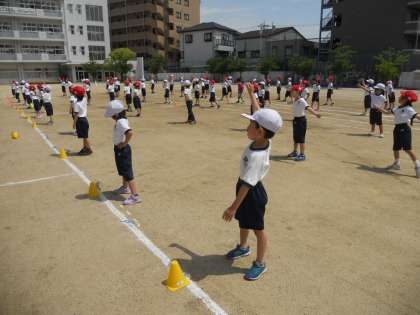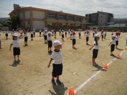 自分の立ち位置の確認など、広い運動場で覚えるのが大変でしょうが、体育館でマスターしてきた振り付けを伸び伸びと披露してくれました。
