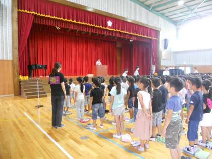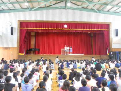 7月3日(月)、児童集会の様子です。午前8時30分までに、全学年が整列を完了し、静かに待てていました。