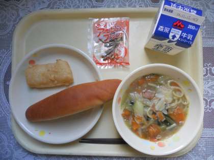 12月5日(火)の給食献立は、野菜ラーメン、いかの天ぷら、フィンガーパン、アーモンドミニフィッシュ、牛乳でした。