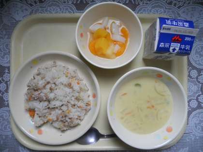 12月8日(金)の給食献立は、ハムピラフ、ポタージュスープ、豆乳杏仁どうふ、牛乳でした。