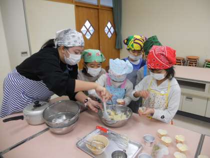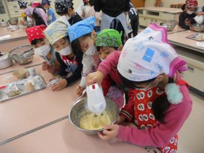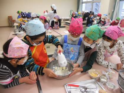 12月8日(金)の1・2時間目、生活科の学習の一環として2年1組が、栽培していたさつまいもを使ったスイーツ「さつまいもマフィン」を楽しく調理していました。