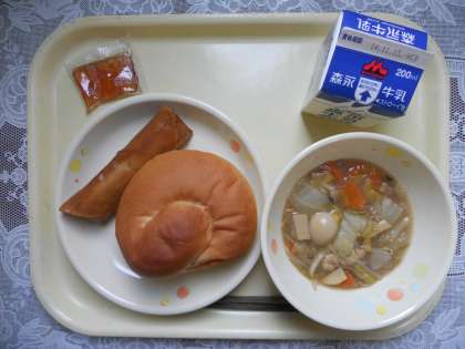 2月13日(火)の給食献立は、鶏肉の中華炒め、春巻、うずまきパン、いちごジャム、牛乳でした。