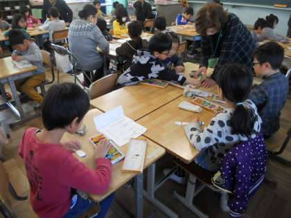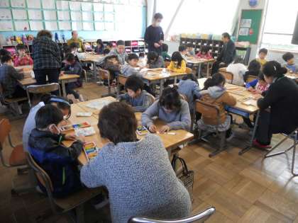写真は、1年1組での交流風景です。