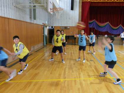 バスケットボール経験者の児童が、未経験者の児童の動きをフォローしたり、アドバイスを送ったりとみんなが楽しめるバスケットボールを追及していました。