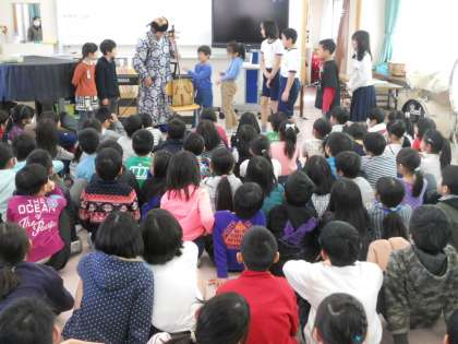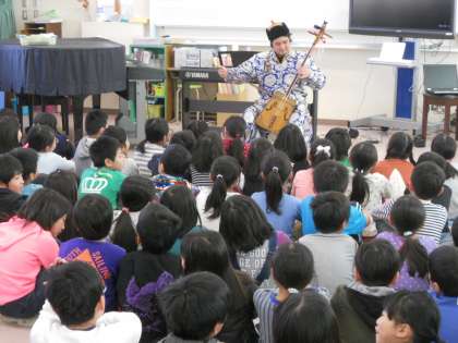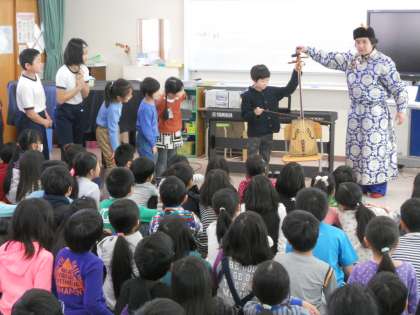 1時間を超えるご講演でしたがモンゴルの遊牧民の住居「ゲル」の紹介などモンゴルの自然やくらし、文化などを紹介していただいた後、弦楽器「馬頭琴」の音色を聴かせていただき、クイズに参加した児童は演奏体験もさせていただきました。
