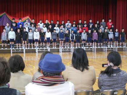 卒業を目前に控えた6年生。合唱や運動会で披露したソーランと組立体操にアレンジを加えた集団演技、そして、最後は感謝のメッセージを一人ひとりが精いっぱい表現しました。体育館に響き渡る声量で、小学校生活6年間の思いが伝わってきました。