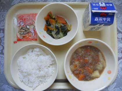 3月6日(火)の給食献立は、じゃがいものそぼろ煮、おかかあえ、ごはん、アーモンドミニフィッシュ、牛乳でした。