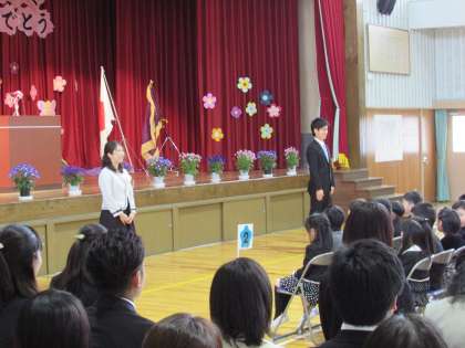 式辞では、本校の「校章」のデザインに桜の花びらが使われていることから、「さ・く・ら」で始まる3つのお話を新1年生にしました。