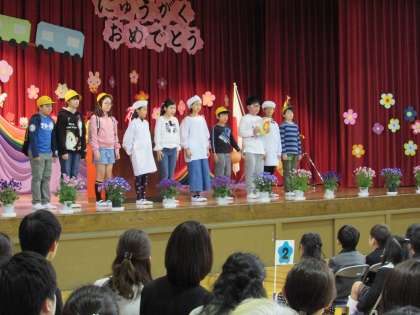 写真にもあるように前年度の児童会の子どもたちが、住北小の学校生活を劇仕立てで元気いっぱいに紹介してくれました。