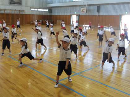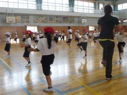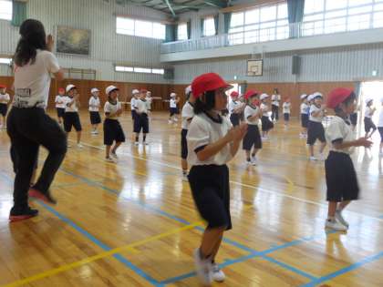 2時間目に1年生が、ダンスの練習をしていました。どうやら2曲踊るようで、鈴木先生と羽田先生のお手本を見ながら、とても真似っこ上手でおぼえるのが早いと褒めてもらっていました。