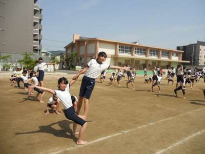 5時間目に6年生が運動場で組体操の練習をしていました。