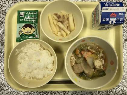6月1日(金)のちゃんこ煮、じゃがいも炒め、ごはん、ふりかけ、牛乳でした。