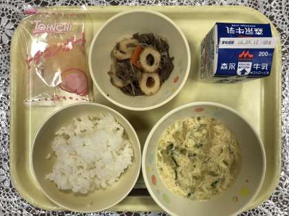 9月3日(月)の給食献立は、かきたま汁、牛肉のあまから煮、ごはん、冷凍もも、牛乳でした。