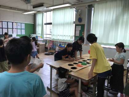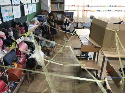 4年1組「ポンポコもぐらたたき」、4年2組「くぐりぬけろ!脱出テープめいろ」です。