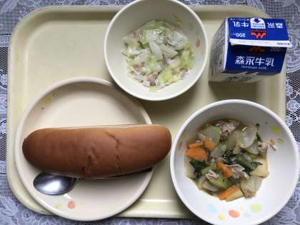 9月6日(木)の給食献立は、きのこのバター煮、キャベツとハムのサラダ、ノンエッグマヨ、黒糖パン、牛乳でした。