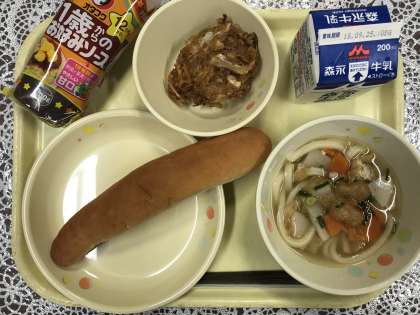9月18日(火)の給食献立は、きざみうどん、フィンガーパン、おこのみ揚げ、おこのみソース、牛乳でした。