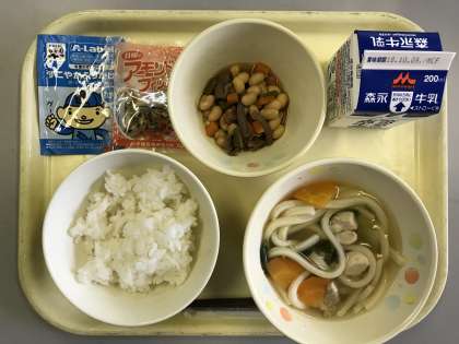 10月2日(火)の給食献立は、かやくうどん、五目豆、ふりかけ、ごはん、アーモンドミニフィッシュ、牛乳でした。
