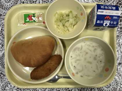 10月9日(火)の給食献立は、おいものポタージュ、バーガーパン、白身魚フライ、キャベツソテー、タルタルソース、牛乳でした。