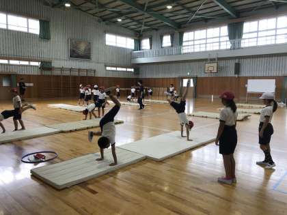 その授業の流れに沿って、1組の子どもたちが、事前に授業を公開してくれたわけですが、課題である新しい技「開脚後転」についてグループで学び合い、たくさんの子ができるようになっていました。