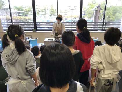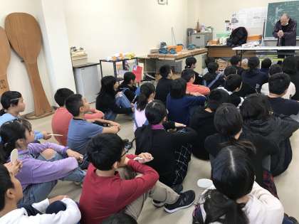 写真は、出会う人、お一人お一人のお話をしっかりと聞く子どもたちの様子です。
