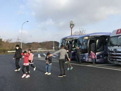 最初の休憩場所、加西サービスエリアに到着しました。周りを気づかい、車内では、仮眠をとる子もいてとても静かに過ごせていました。この後、先生におやつを配っていただき、バスレクを楽しみます。