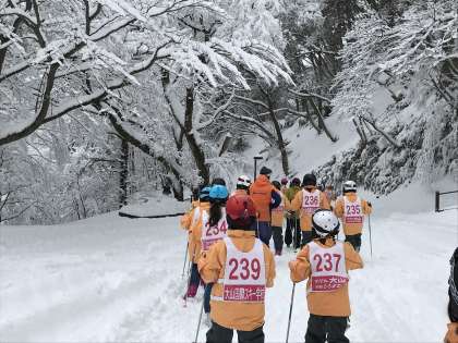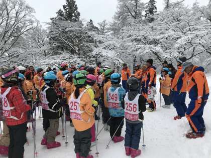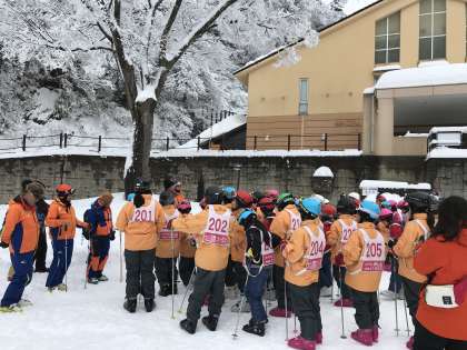 スキー教室の開校式です。インストラクターの皆さんとの初めての出会い。2日間、ご指導よろしくお願いいたします。
