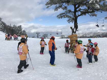 スキー教室が始まりました。ストックを持って、入念に準備運動を済ませました。