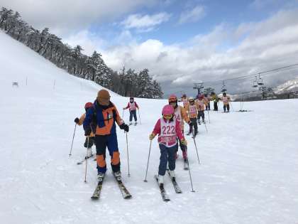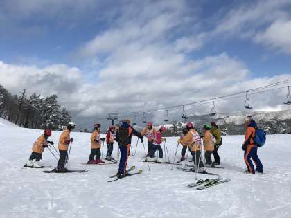続いて、スキー板に慣れる練習へと移り平坦なところを片足スキーで歩いたり両足スキーで歩いたりしました。さらに、少し斜度のあるところを登ったりもしました。新雪が積もり、青空の下、最高のコンディションです。