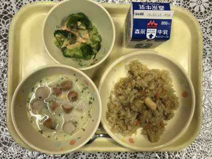 2月6日(水)の給食献立は、パエリア、クリーミースープ、ブロッコリー、サウザンドレッシング、牛乳でした。