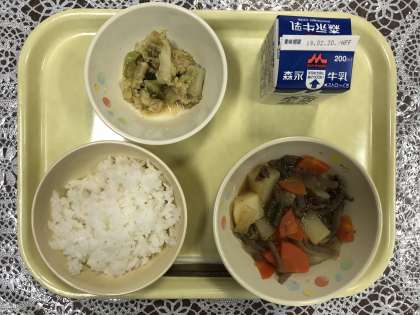 2月13日(水)の給食献立は、ごはん、肉じゃが、かつおあえ、牛乳でした。