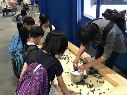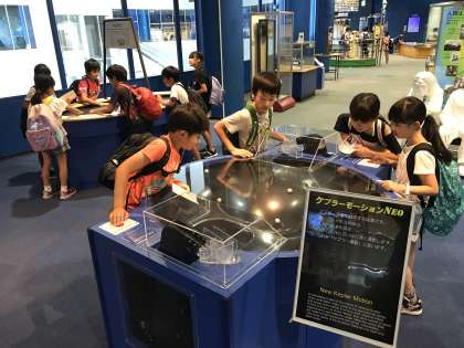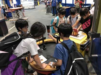 大阪市立科学館内の1階から4階までの各展示場は、それぞれテーマが設けられていて、科学のおもしろさに子どもたちのワクワク感もMAX。4人グループで、各展示にさわったり、確かめたり、観察したりと、チャレンジ精神旺盛に楽しんでいました。