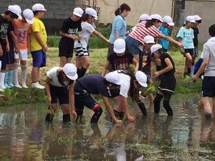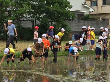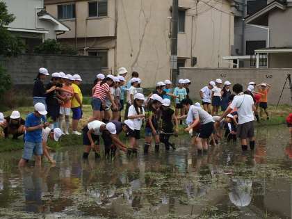 5年生が、谷川地区の中島さんの田んぼで田植え体験をさせていただきました。大東市の学校給食でも取り入れている「ヒノヒカリ」という品種のお米を栽培されています。日本で育てられているお米の種類は、約490種類ありますが、ヒノヒカリは、3番目に収穫量の多い品種だそうです。大阪では、1番多く育てられています。