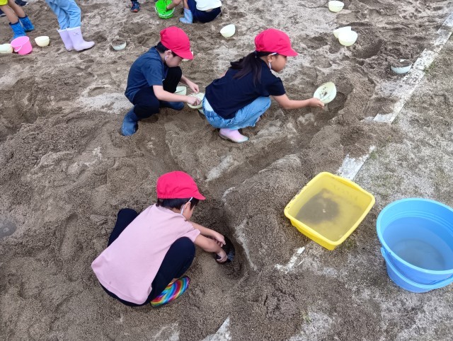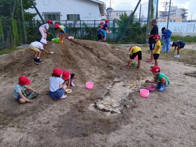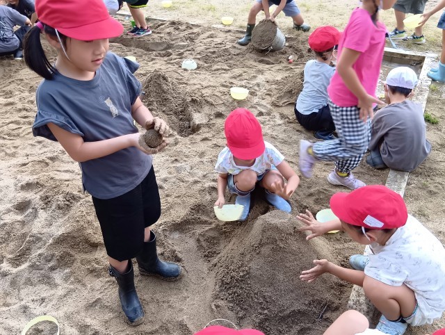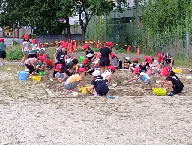 砂場でみんなが一心不乱に何かをしています。近寄ってみると、どろだんごや、川や山などを作って遊んでいます。図工や理科や体育などに通じる経験がいっぱいつまった、楽しい活動です。普段こんなことをする機会はあまりない子も多いんじゃないかな?今日は洗濯が大変かもしれませんね。すみませんが、よろしくお願いします。