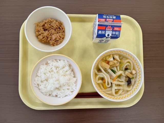 献立は、きざみうどん、シーチキンのそぼろ煮、ご飯、牛乳 です。