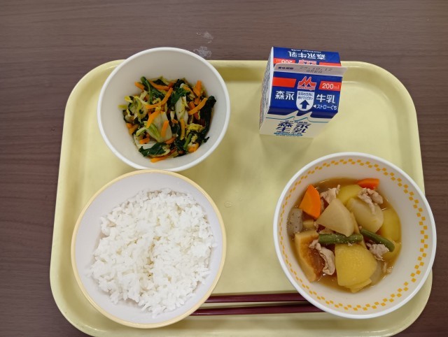 献立は、みそおでん、おかか和え、ごはん、牛乳 です。