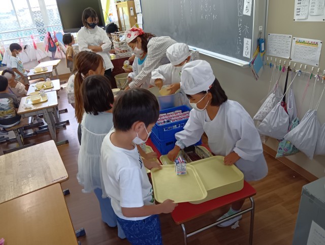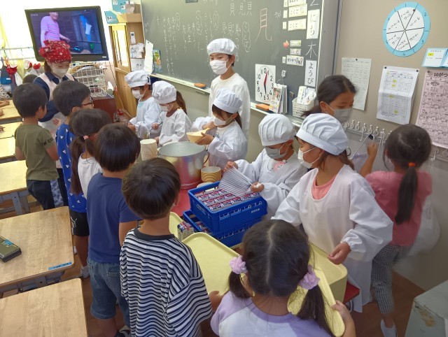 1年生の配膳の様子です。背の高い子は、お手伝いに来てくれている6年生です。1年生が自分でできるように見守ってくれていますね。さすがだ!1年生も、自信を持って配膳しています。ちょうど半年。大きな成長です。