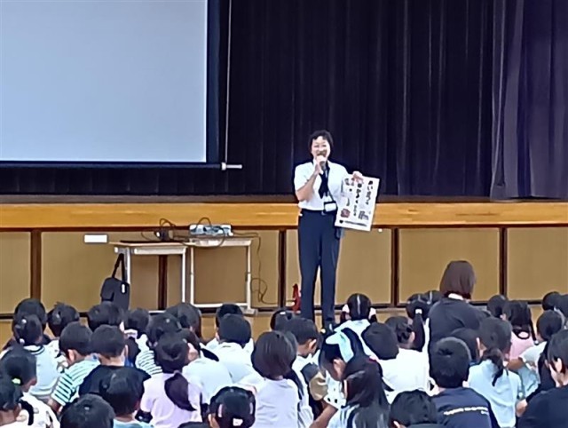 私からは、「あいさつをしよう」ということと、「黄帽をかぶろう」、そして、「今年は終戦80周年」の三つについて話をしました。