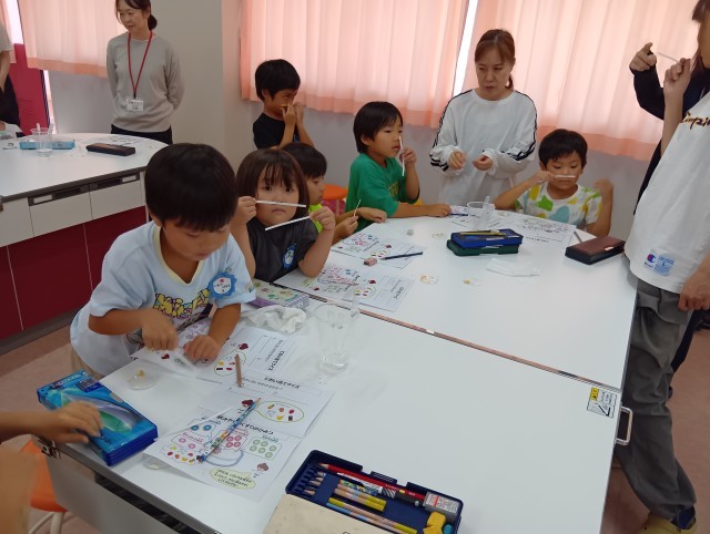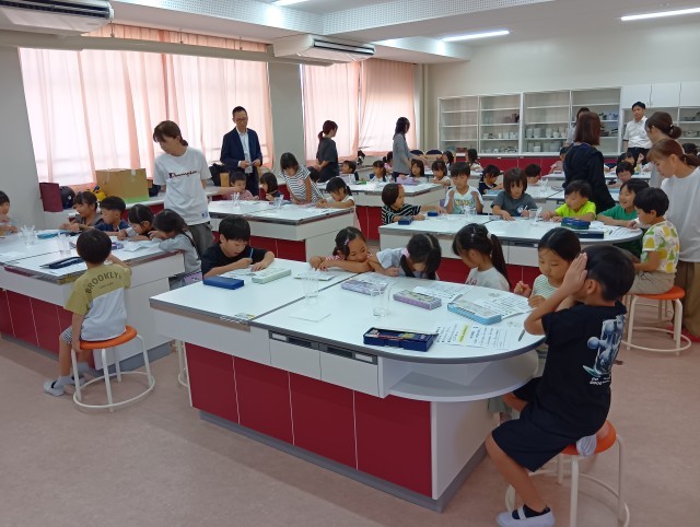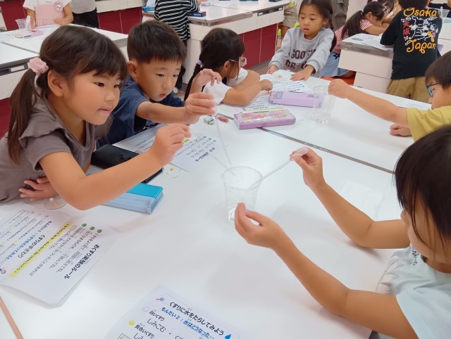 本日の先生は、東和薬品会社の方です。お薬の開発について、説明と実験をしてくれて、最後にはお土産もいただきました。1年生の子たちがスポイトをうまく使って実験するのを見て、ちょっとびっくりしました。講師のみなさん、ありがとうございました!