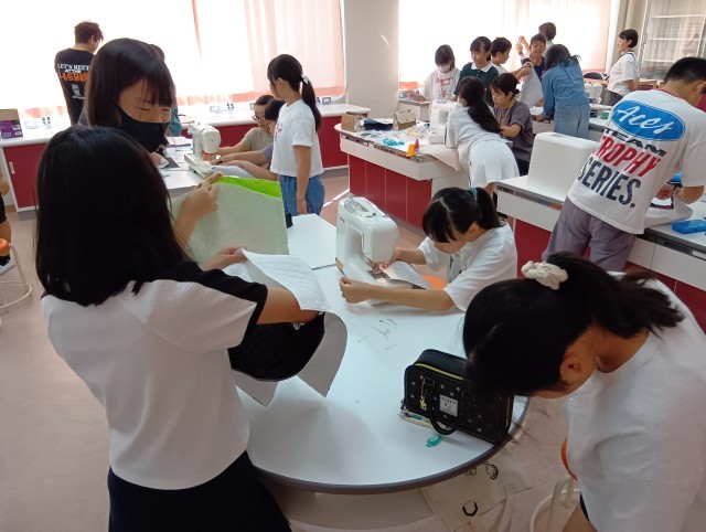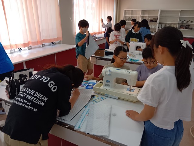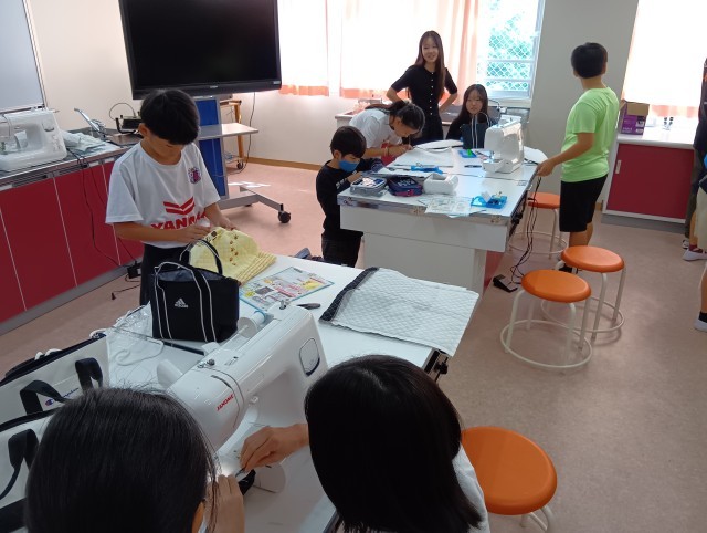1,2時間目の家庭科室で、ミシンを使った作業をしています。チャコを引いたキルティングの布をこの2時間で背負える巾着袋に仕上げます。頑張れ!