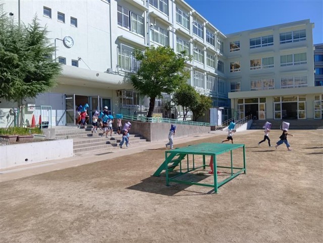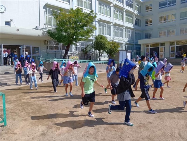 地震を想定した避難訓練を行いました。防災頭巾をかぶり、運動場に避難しました。みんな、迅速に行動できました。