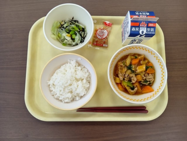 献立は、厚揚げの五目炒め煮、ひじきサラダ、ごまドレッシング、ごはん、牛乳 です。