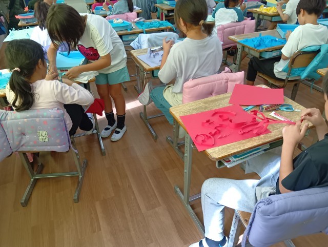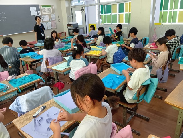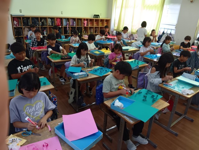 先日習った基本をもとにして自分の作品を作っています。やり方がしっかり分かっているから、一心不乱に制作に取り組んでいますね。次の参観日には完成品を廊下に飾って見てもらえるかな?