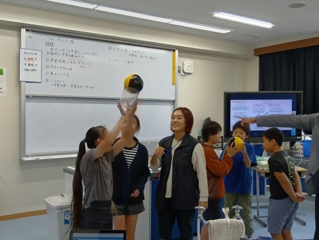 月と太陽の位置関係を理解するのが難しい単元。理科室にはいろんな資料や実験道具が用意されていて、まるでおもちゃ箱ですね。