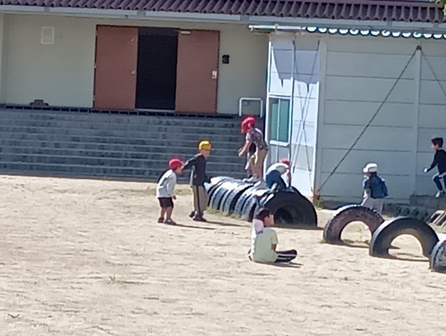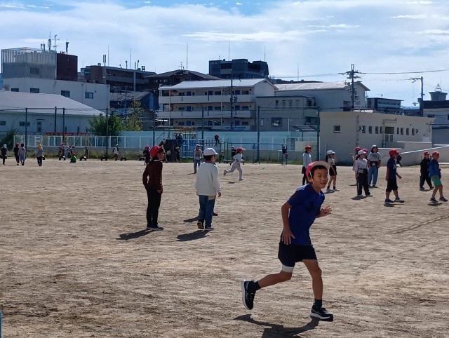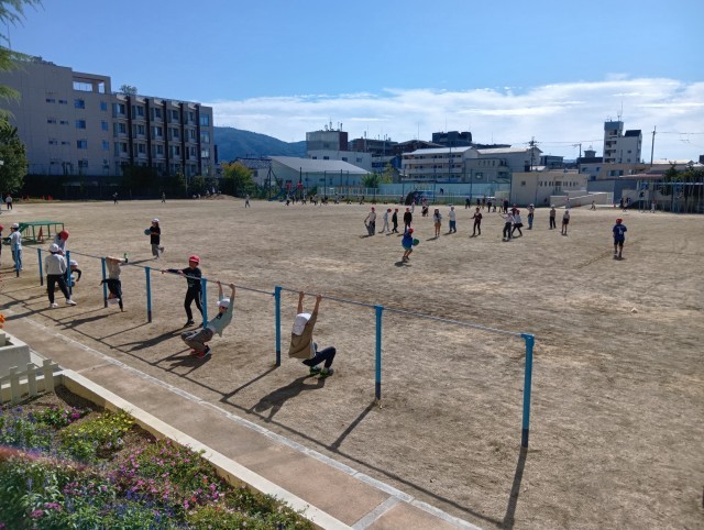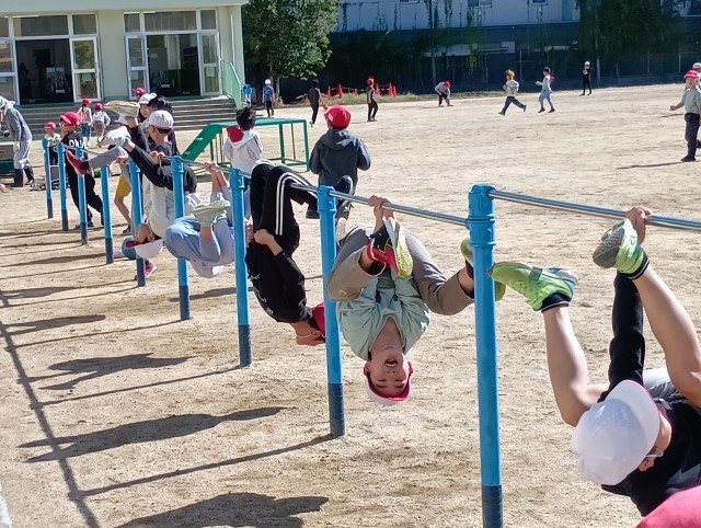 今日は青空が広がり、スッキリとしたお天気で、外遊び日和です。みんな力いっぱい運動場であそんでいます。いろんな遊具やボールも人気がありますが、てつぼうが好きな子も多いようです。