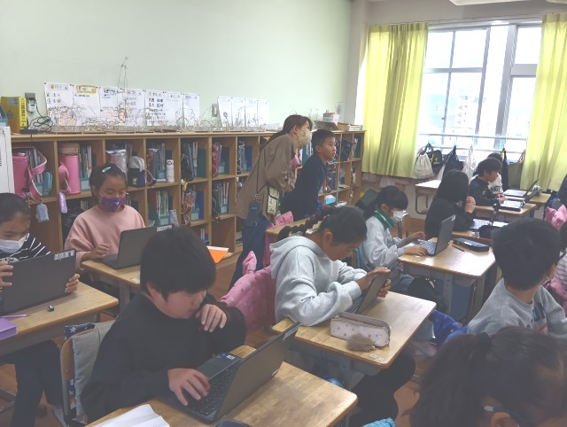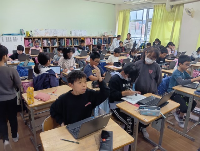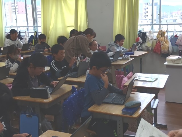 「平均」についての学習のために、全員がクラスのみんなにアンケートを取っています。PCのアンケート機能を使って、自分の決めた質問でクラスのみんなからアンケートを取り、その結果を集計します。